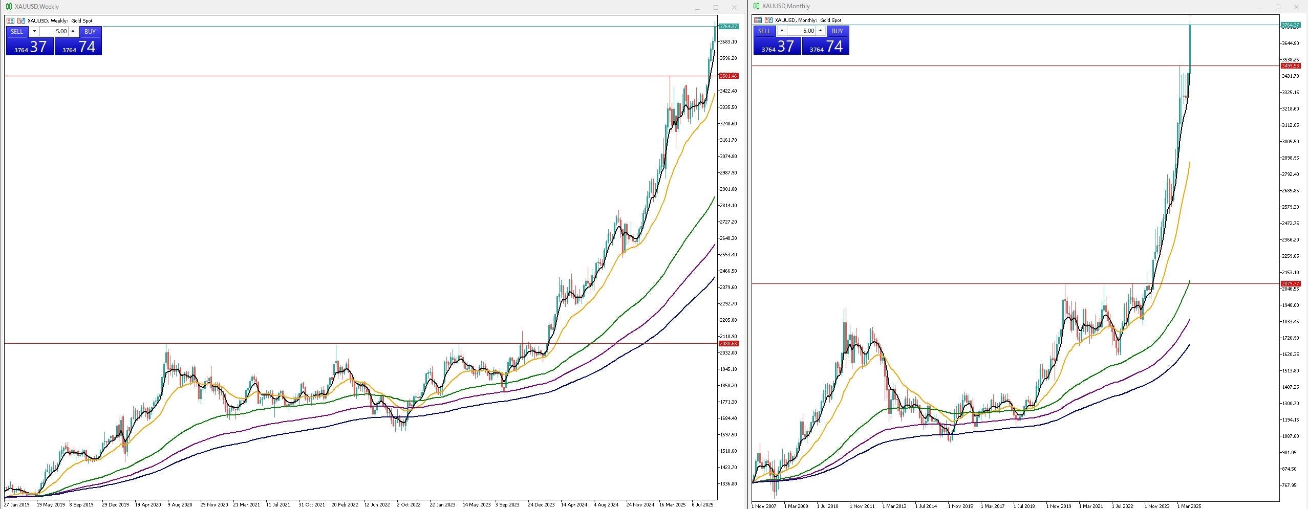 しかし、ゴールドはとにかく過熱気味です。左が週足、右が月足ですが、月足の異常な上昇角度が気になります。移動平均線からの乖離も激しく調整下落が始まれば大きく下落する可能性がありますので注意深く観察しながら取引したいですね。