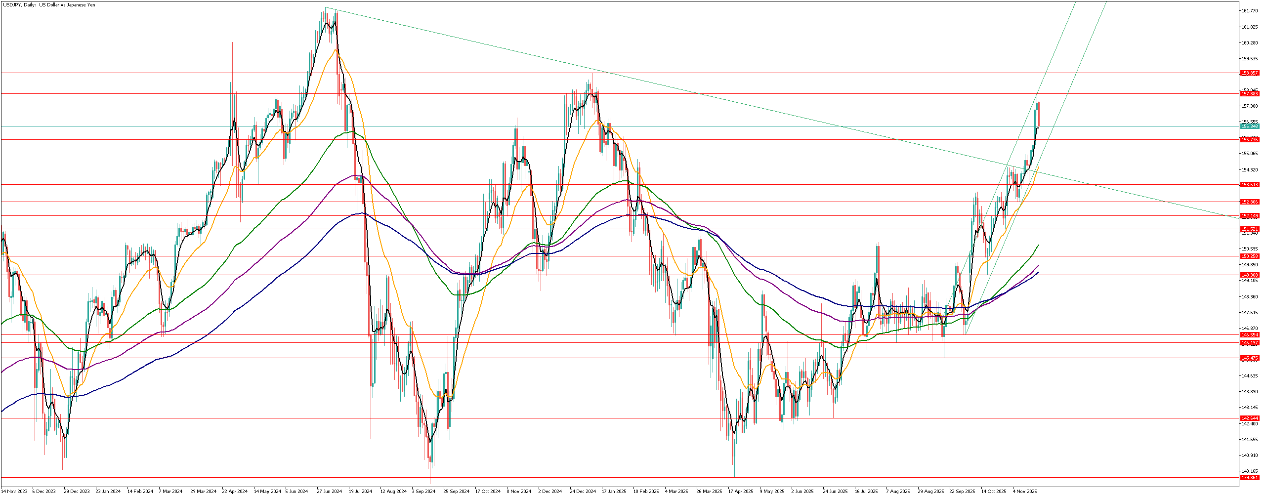 155.73、上昇トレンドのサポート付近などが目安です。今は様子を見ながら押目を待つのが良いと思います。押目をつけなければ、高値切り下げラインの上抜け後サポレジを見てからロングという戦略です。