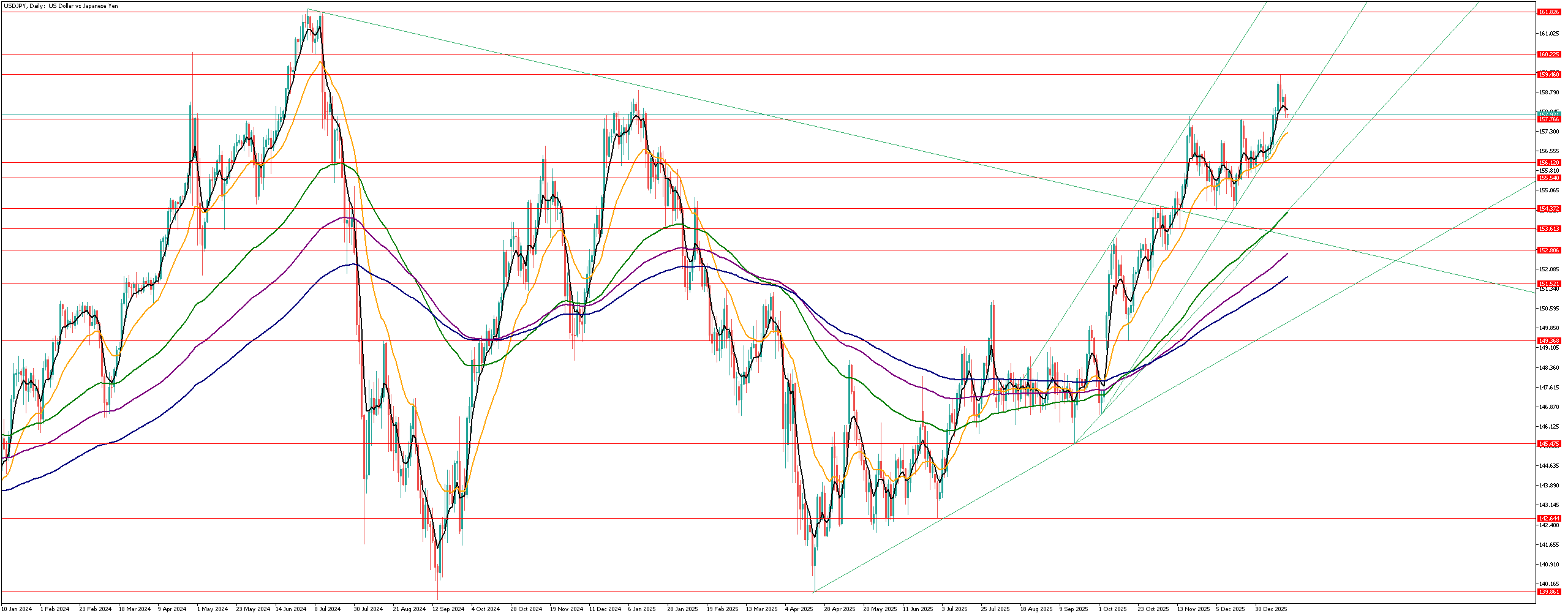 160円を目指す展開と思っていましたが勢いを失い直近のレジスタンスラインまで落ちてきました。下からの安値切り上げラインと重なるポイントとなっていますので、ここでサポートされるかがポイントです。